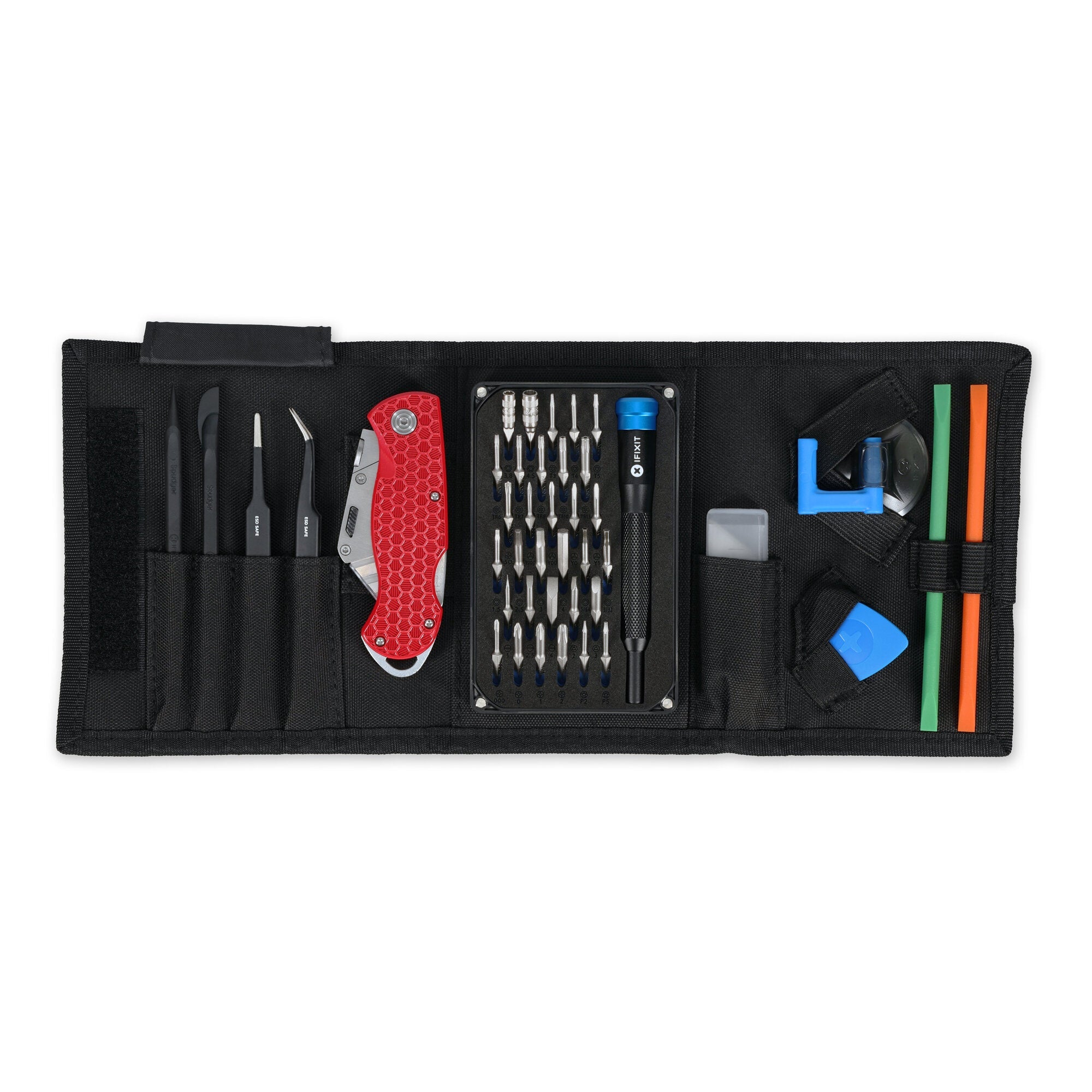 iFixit has teamed up with Zack Nelson of JerryRigEverything on an exclusive toolkit built to pass and conduct a durability test. Whether you’re working on smartphones and game consoles or wheelchairs and Electric Hummers, tackle it all with our signature aluminum driver and 32 precision bits, including extra Torx and Hex Security varieties. Use a curated selection of high-quality opening, prying, and gripping tools—including heavy-duty Prying Sticks in Zack-inspired colors—to navigate tight spaces and delicate connectors. And for projects that require a bit more brute force: the JerryRig Utility Tool in don’t-accidentally-slice-your-finger off red. Store it all in our signature portable fabric roll proclaiming our joint repair powers.