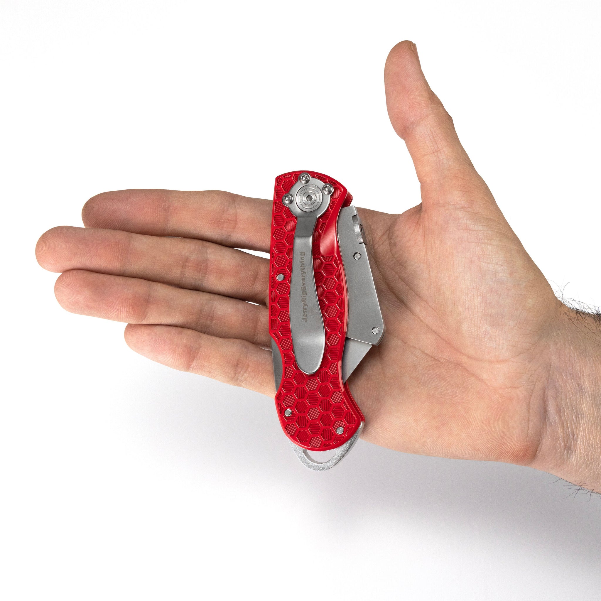 Made using an Aluminum-Zinc alloy, The JerryRig Utility Tool uses premium materials to ensure it's the perfect weight and size for both your pockets and your hands. The all metal handle is textured with a tessellated hexagon pattern that gives you a confident grip, and the built-in JerryRigEverything belt clip serves as your constant reminder that Life is a DIY project.